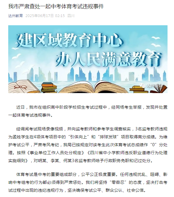 四川达州查处一起中考体育考试违规事件:3名监考教师违规为一学生在项目中取得高分被免职、记过